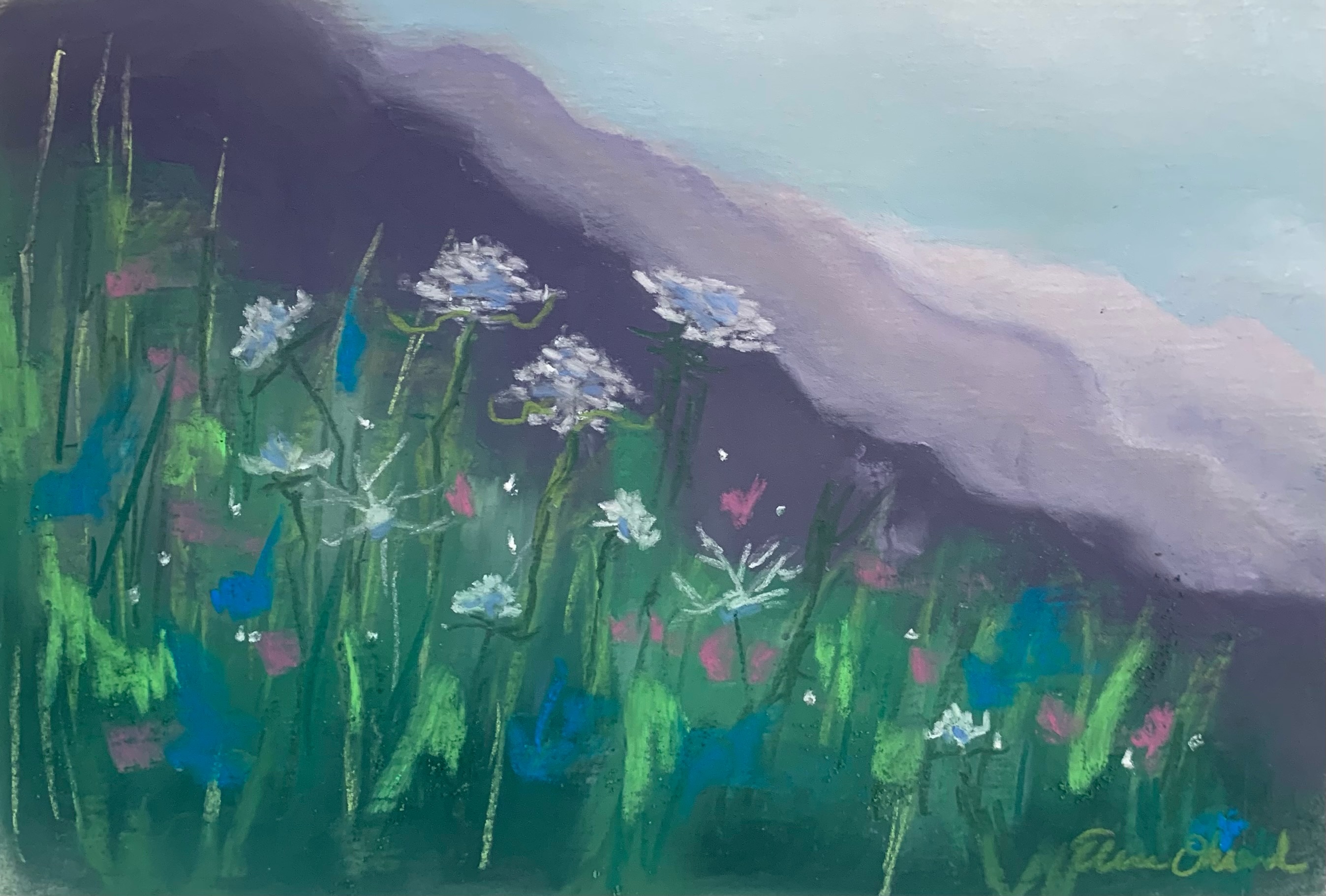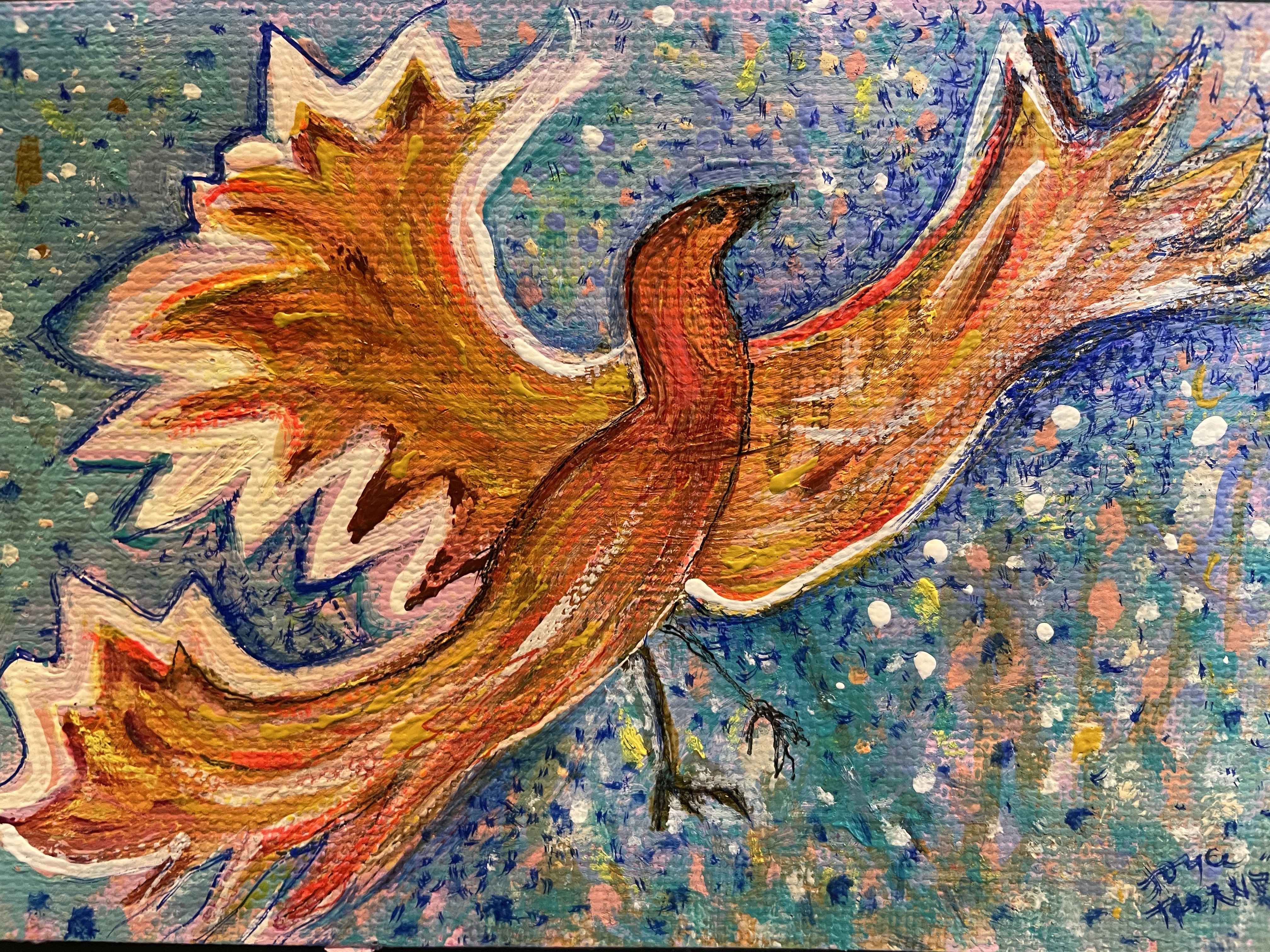 Flapper by Cheryl Eugenia Barnes, Mountains by Elise Okrend, Phoenix by Joyce Thornburg and Zelda’s Flowers by Elise Okrend.
